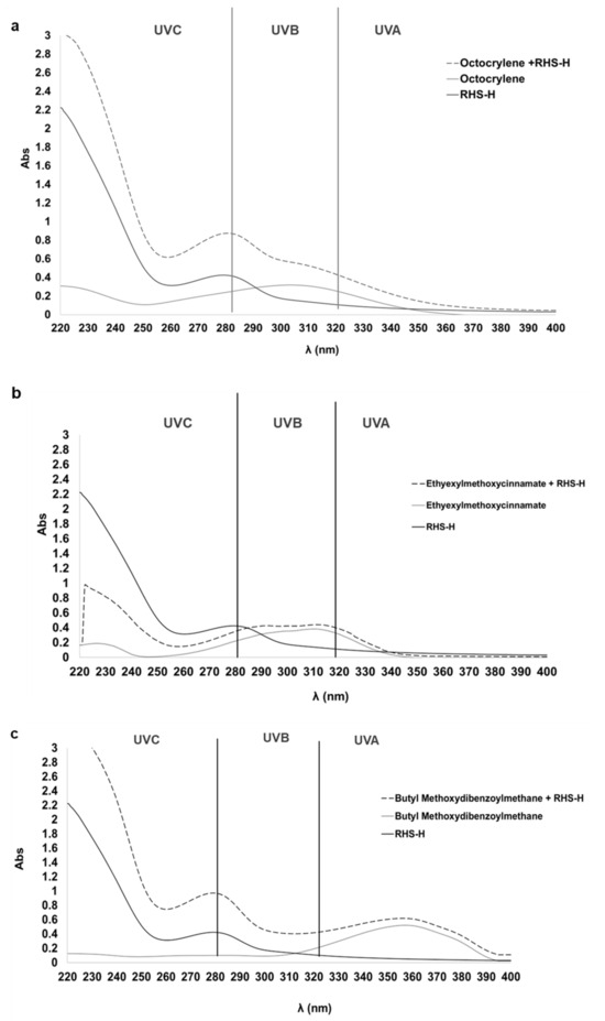 UV absorption spectra (220–400 nm) of RHS-H, synthetic UV filters, and their combinations. (a) Octocrylene (light gray line), RHS-H (dark gray line), and their mixture (dotted line); (b) Ethylhexyl Methoxycinnamate (light gray), RHS-H (dark gray), and their mixture (dotted); (c) Butyl Methoxydibenzoylmethane (light gray), RHS-H (dark gray), and their mixture (dotted). RHS-H enhances UV absorbance, particularly in the UVC and UVB regions.