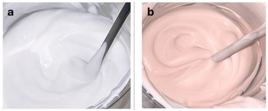 Macroscopic appearance of O/W emulsions: (a) control formulation F1 (white); (b) formulations F2–F4 containing RHS-H (pinkish).