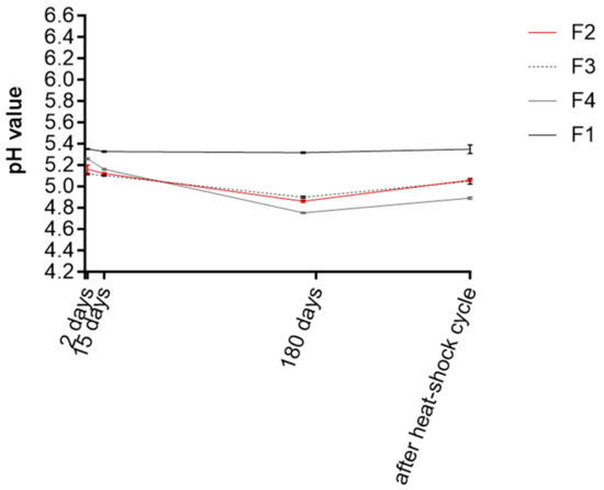 pH values of emulsions F1–F4 measured at 48 h, 15 days, 180 days, and after thermal shock cycles. Data are presented as mean ± SD (n = 3).