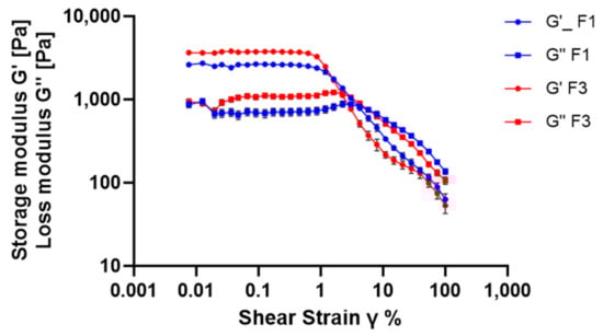 Rheological behavior of F1 and F3 emulsions was analyzed with an MCR102 rheometer (Anton Paar, Graz, Austria) equipped with a CP50-1 cone–plate system (diameter 49.980 mm, cone angle 0.989°, truncation 99 µm). Data acquisition and processing were performed using RheoCompass™ software [27]. Both steady-shear and oscillatory tests were conducted. Flow properties were determined by recording viscosity (mPa·s) across shear rates ranging from 0.01 to 1000 s−1 (21 points per decade) within 30 s. Amplitude sweep experiments, performed at a constant frequency of 10 s−1 with strain increasing from 0.01% to 100% (logarithmic mode), were used to define the Linear Viscoelastic Region (LVR). Frequency sweep measurements were then carried out at a constant stress within the LVR, over an angular frequency range of 0.1–100 rad·s−1. All experiments were performed in triplicate at 25.0 ± 1.0 °C.