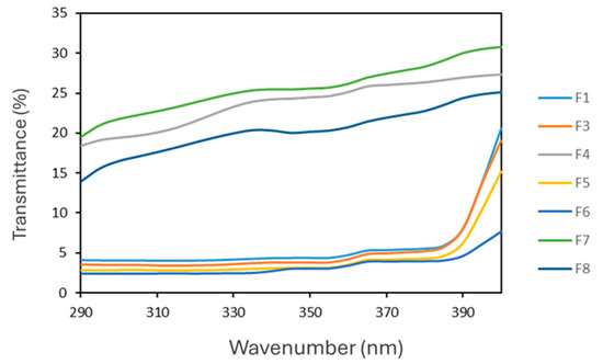 In addition, the UVA/UVB ratio and the critical wavelength (Cλ) were calculated from the absorbance spectrum using Equations (3) and (4), respectively.