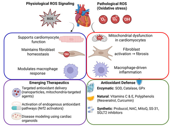 Schematic diagram illustrating oxidative stress and antioxidant mechanisms in cardiovascular health. Balanced ROS signaling supports normal cardiac function, whereas excessive ROS causes cellular damage, leading to cardiac dysfunction, fibrosis, and inflammation. Antioxidant defenses and emerging targeted therapeutic strategies aim to restore cardiovascular homeostasis.