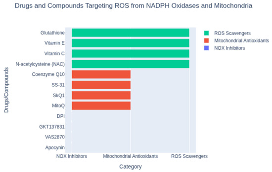 Classification of compounds targeting reactive oxygen species (ROS) from NADPH oxidases and mitochondria. Shown are representative agents grouped by mechanism: NOX inhibitors (e.g., apocynin, VAS2870), mitochondrial antioxidants (e.g., MitoQ, SS-31), and ROS scavengers (e.g., N-acetylcysteine, vitamin C). This classification highlights distinct strategies for mitigating oxidative stress.
