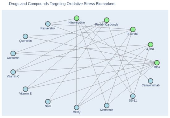 Network diagram illustrating the relationship between oxidative stress biomarkers and inhibitory compounds. Green nodes represent canonical biomarkers of oxidative stress, including malondialdehyde (MDA), 4-hydroxynonenal (4-HNE), 8-hydroxy-2′-deoxyguanosine (8-OHdG), protein carbonyls, and nitrotyrosine. Blue nodes denote pharmacological agents and antioxidants reported to attenuate these markers, based on experimental or clinical evidence. Edges indicate documented inhibitory associations between compounds and specific biomarkers. This visualization highlights the mechanistic diversity of antioxidant interventions and their relevance to redox biology. (Created with Copilot).