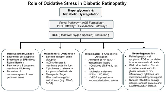 Persistent hyperglycemia triggers a cascade of harmful events in the diabetic retina. It activates several biochemical pathways, including the polyol pathway, AGE formation, protein kinase C (PKC) activation, and the hexosamine pathway flux [6]. These alterations impair retinal microvascular homeostasis by inducing pericyte loss, endothelial dysfunction, and thickening of the basement membrane, ultimately leading to breakdown of the BRB. A unifying feature of these pathways is the overproduction of ROS, which amplifies vascular injury and inflammatory signaling. In addition, hyperglycemia-driven mitochondrial dysfunction further accelerates ROS generation through excessive electron transport chain activity, resulting in oxidative DNA damage, impaired intracellular signaling, and apoptosis of retinal cells [7,9].