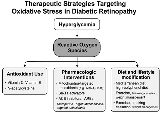 Although interventional trials targeting oxidative stress in human DR patients remain limited, the number of reports has been gradually increasing. For example, supplementation with antioxidant nutrients—such as vitamins C and E, lutein, and zeaxanthin—has been reported to help maintain visual function and retinal structure in patients with NPDR [50,51].