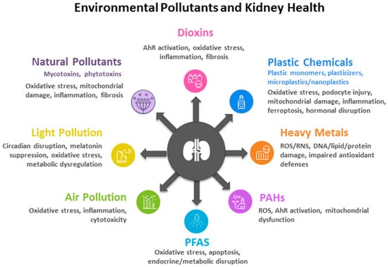 Common toxicants [9,10]—including heavy metals (e.g., lead, cadmium) [11], air pollutants (e.g., PM2.5) [12], emerging plastic contaminants such as bisphenol A (BPA), phthalates, and microplastics/nanoplastics (MPs/NPs) [13,14,15], as well as environmental stressors like chronic light pollution—can bioaccumulate in kidney tissues or exert systemic effects that impair kidney function. These exposures induce oxidative stress, trigger chronic inflammation, disrupt endothelial and circadian-regulated pathways, and contribute to tubular injury, glomerular damage, and interstitial fibrosis [9,10,11,12,13,14,15].