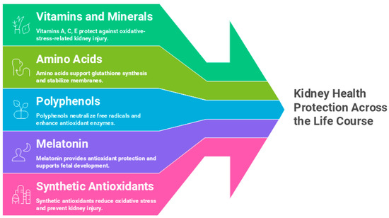 Animal studies reviewed elsewhere [21] show that maternal supplementation with natural antioxidants—including vitamins C and E, amino acids such as arginine and taurine, melatonin, and polyphenols—during pregnancy and lactation can protect kidney development and mitigate the risk of renal programming. In addition to natural compounds, several synthetic antioxidants have also been tested in animal models [63,64,65,66], showing potential to mitigate oxidative stress and preserve kidney function in offspring. Therefore, oxidative stress is both a mediator and amplifier of developmental kidney injury, linking early-life environmental exposures to lifelong kidney health outcomes through the concept of DOHaD. Targeting oxidative stress during these sensitive periods may offer preventive strategies to mitigate programmed kidney disease risk.