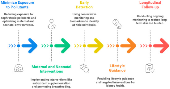 Oxidative stress is a central pathogenic mechanism in pollutant-induced kidney disease [17,18,19]. Many environmental toxicants stimulate excessive production of reactive oxygen and nitrogen species (ROS/RNS), disrupting redox homeostasis and causing oxidative damage to DNA, proteins, and lipids in renal tissues. During pregnancy, elevated oxidative stress may also trigger epigenetic modifications that alter gene expression and contribute to the developmental programming of CKD [20]. Conversely, antioxidant therapies have demonstrated both renoprotective and reprogramming effects in preclinical models of kidney programming linked to early-life environmental exposures [21]. CKD is influenced not only by environmental toxicants but also by occupational exposures—metals, solvents, heat, and work-related stress—that cause renal injury through oxidative stress and mitochondrial dysfunction [22]. Targeting these oxidative stress pathways provides a promising strategy for early detection, prevention, and intervention, particularly in vulnerable populations such as children, pregnant women, and individuals with pre-existing kidney disease.