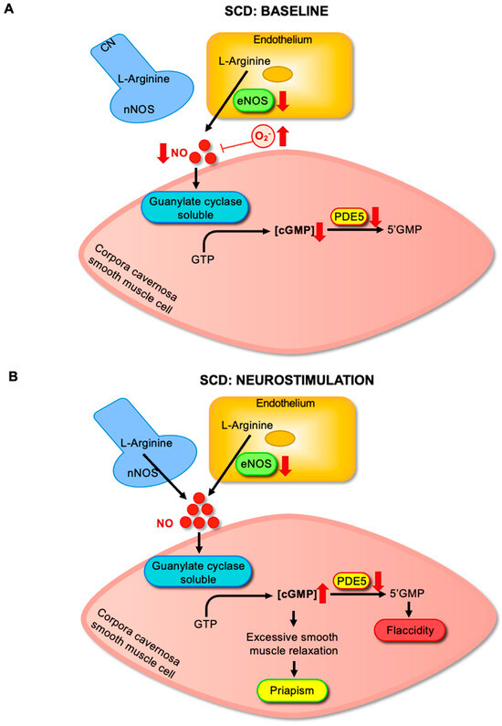 Experimental and clinical evidence has established that priapism in SCD is primarily driven by dysregulation of the NO–cGMP–PDE5 signaling axis [6,24,25]. Reduced NO bioavailability in the corpus cavernosum of SCD patients and animal models leads to chronically diminished basal cGMP levels [9,11,12,13,24]. Because PDE5 expression is positively regulated by intracellular cGMP concentrations, reduced basal levels result in marked downregulation of PDE5 protein in cavernous smooth muscle cells [26] (Figure 2A). As a result, upon sexual or nocturnal stimuli that transiently increase NO, cGMP accumulates abnormally, triggering exaggerated smooth muscle relaxation and initiating prolonged, unregulated penile erection [5] (Figure 2B).