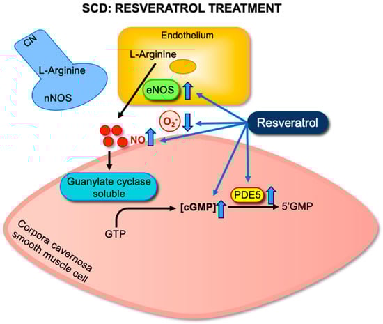 The therapeutic potential of resveratrol in SCD-associated priapism has been thoroughly investigated using transgenic mouse models that replicate key pathophysiological features of the human condition. These include chronic intravascular hemolysis, oxidative stress, and dysregulation of NO signaling within the corpus cavernosum. In a recent study, male SCD mice (Townes model) received oral resveratrol at a dose of 100 mg/kg/day for 14 consecutive days, and the effects were evaluated through both functional and molecular endpoints [19].