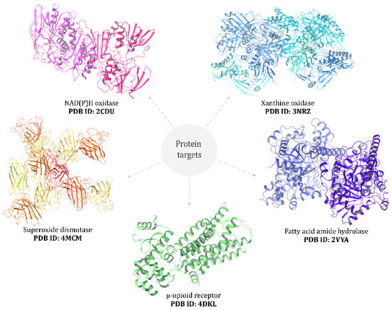 Black maca extract was docked into the binding sites of selected protein targets: NAD(P)H oxidase, xanthine oxidase, superoxide dismutase, μ-opioid receptor, and fatty acid amide hydrolase (PDB IDs indicated in the figure).