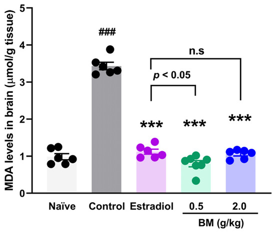 Given that lipid peroxidation is a free radical–driven process in which reactive oxygen species (ROS) attack polyunsaturated fatty acids in cellular membranes, we measured malondialdehyde (MDA) levels as a reliable biomarker of oxidative damage in neural tissue. In addition to behavioral outcomes, OVX animals exhibited a marked increase in brain MDA concentrations (3.44 ± 0.1 µmol/g tissue) compared with naïve rats (0.98 ± 0.08 µmol/g tissue; p < 0.001) (Figure 4). Estradiol treatment significantly reduced MDA concentrations (1.12 ± 0.07 µmol/g tissue; p < 0.001 vs. control), restoring values to those of naïve animals. Similarly, BM at both 0.5 g/kg (0.79 ± 0.08 µmol/g tissue) and 2.0 g/kg (1.06 ± 0.05 µmol/g tissue) significantly decreased MDA levels compared with OVX controls (p < 0.001). No significant differences were observed between the BM 2.0 g/kg and estradiol groups (p > 0.05), suggesting a comparable antioxidant effect. Although the 2.0 g/kg dose showed slightly higher MDA values than 0.5 g/kg, the difference was not statistically significant, indicating a plateau in the antioxidant efficacy of BM at higher concentrations.