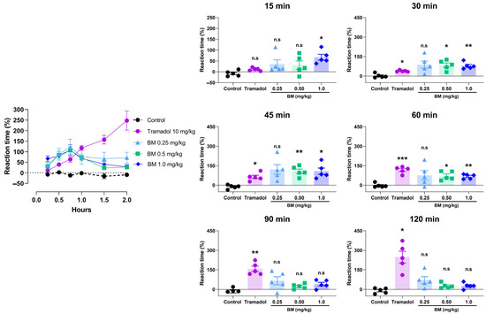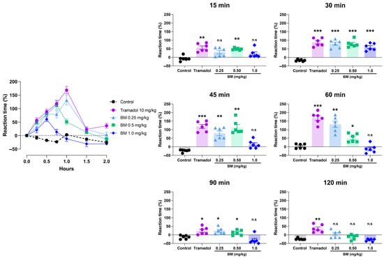 Antinociceptive effect of the lyophilized aqueous extract of black maca (Lepidium meyenii Walp., BM) hypocotyl in the hot-plate test in rats. Reaction latency (time to paw licking or jumping) was recorded at baseline (0 min) and at 15, 30, 45, 60, 90, and 120 min after oral administration of BM at doses of 0.25, 0.5, and 1.0 mg/kg. Tramadol (10 mg/kg, p.o.) was used as the reference drug, and 0.9% NaCl served as the vehicle control. Data are expressed as mean ± SEM (n = 6 per group). Statistical significance was determined by two-way ANOVA followed by Tukey’s post hoc test. * p < 0.05, ** p < 0.01, *** p < 0.001 vs. control group; n.s., not significant vs. control group.