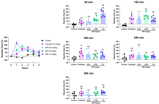 Antinociceptive effect of the lyophilized aqueous extract of black maca (Lepidium meyenii Walp., BM) hypocotyl in the tail immersion test in rats. Tail-flick latency was recorded at baseline (0 h) and at 60, 120, 180, 240, and 300 min. after oral administration of BM at doses of 0.25, 0.5, and 1.0 mg/kg. Tramadol (10 mg/kg, p.o.) was used as the reference drug, and 0.9% NaCl served as the vehicle control. Data are expressed as mean ± SEM (n = 6 per group). Statistical significance was determined by two-way ANOVA followed by Tukey’s post hoc test. * p < 0.05, ** p < 0.01 vs. vehicle; ## p < 0.01 vs. tramadol; n.s., not significant vs. control group.