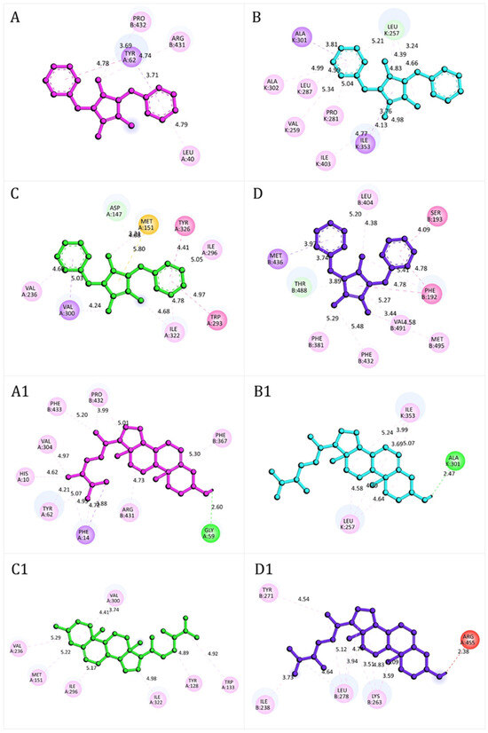 Representative docking interactions of compound 6 (A–D) and compound 8 (A1–D1) with NADPH oxidase (A,A1), xanthine oxidase (B,B1), μ-opioid receptor (C,C1), and fatty acid amide hydrolase receptor (D,D1). Hydrogen atoms are omitted in some cases for clarity. Interaction types: green, conventional hydrogen bonds; light green, carbon-hydrogen bonds or π-donor hydrogen bonds; red, unfavorable donor–donor contacts; purple, π (aromatic)–σ interactions; yellow, π–sulfur interactions; fuchsia, amide–π stacked or π–π T-shaped interactions; pink, alkyl or π–alkyl interactions.