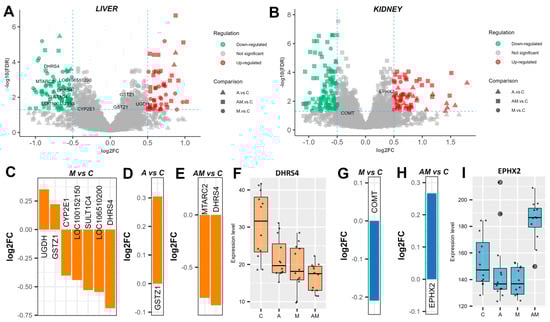 Dietary supplementation modulates toxin metabolism. Volcano plots highlighting proteins involved in toxin metabolism in the liver (A) and kidney (B) cytoplasmatic fractions, showing log2 fold change (log2FC) for A versus C, M versus C, and AM versus C, with an FDR-adjusted p value < 0.05, and log2FC thresholds of −0.5 and 0.5. Bar plots represent the expression level of significantly changed proteins in the liver cytoplasmatic fraction for M versus C (C), A versus C (D), and AM versus C (E). A box plot shows the expression level of dehydrogenase/reductase SDR family member 4 (EC 1.1.1.184, DHRS4) (F). Bar plots represent protein expression level of significant changed proteins in the kidney cytoplasmatic fraction for M versus C (G), and AM versus C (H). A box plot shows the expression levels of cytosolic epoxide hydrolase 2 (EPHX2) (I). The C group represents the control group of weaned piglets (C) fed with a basal diet. The A group was fed with the basal diet plus a mixture of two antioxidant byproducts (grapeseed and sea buckthorn meal. The M group was fed with the basal diet artificially contaminated with two mycotoxins (AFB1 and OTA). The AM group represents the weaned piglets fed with the basal diet containing the mixture (1:1) of antioxidant byproducts and the two mycotoxins.