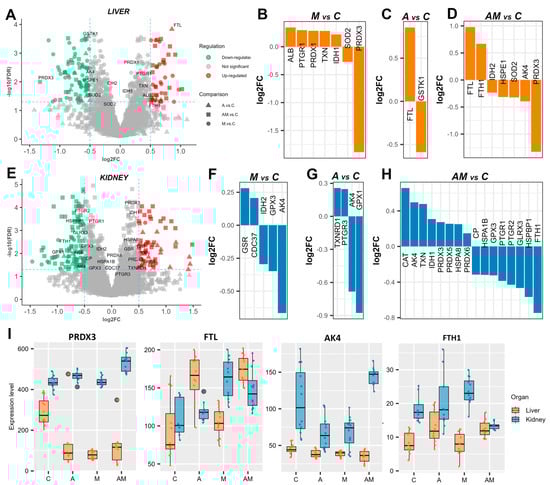 Redox imbalance under exposure to a mycotoxin-contaminated diet. Volcano plots highlighting proteins involved in oxidative stress in the liver (A) and kidney (E) cytoplasmatic fractions, showing log2 fold change (log2FC) for A versus C, M versus C, and AM versus C, with an FDR-adjusted p value < 0.05, and log2FC thresholds of −0.5 and 0.5. Bar plots represent expression levels of significantly changed proteins in the liver cytoplasmatic fraction for M versus C (B), A versus C (C), and AM versus C (D). Bar plots represent protein expression levels of significantly changed proteins in the kidney cytoplasmatic fraction for M versus C (F), A versus C (G), and AM versus C (H). A box plot shows the expression levels of thioredoxin-dependent peroxiredoxin 3 (PRDX3), ferritin light chain (FTL), adenylate kinase 4 (AK4), and ferritin heavy chain (FTH1) (I). The C group represents the control group of weaned piglets (C) fed with a basal diet. The A group was fed with the basal diet plus a mixture of two antioxidant byproducts (grapeseed and sea buckthorn meal. The M group was fed with the basal diet artificially contaminated with two mycotoxins (AFB1 and OTA). The AM group represents the weaned piglets fed with the basal diet containing the mixture (1:1) of antioxidant byproducts and the two mycotoxins.