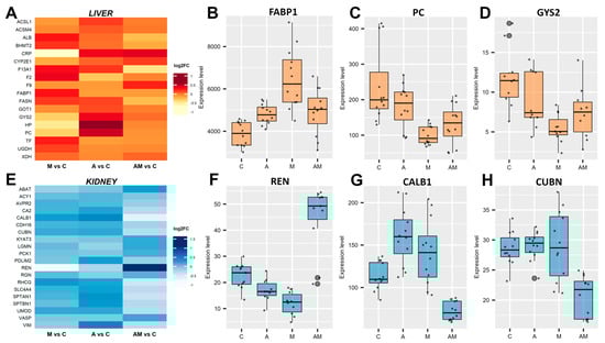 Effects of dietary supplementation on liver and kidney tissue-specific proteins. Heatmap of the differentially expressed proteins, filtered with an FDR-adjusted p value < 0.05, in liver (A) and kidney (E). Box plots show protein expression level (FDR < 0.01) relative to control (C) for antioxidant (A), mycotoxin (M), and antioxidant + mycotoxin (AM) diets. In liver, fatty acid-binding protein 1 (FABP1) (B), pyruvate carboxylase (PC) (C), and glycogen synthase 2 (GYS2) (D). In the kidney, renin (REN) (F), calbindin (CALB1) (G), and cubilin (CUBN) (H). The C group represents the control group of weaned piglets (C) fed with a basal diet. The A group was fed with the basal diet plus a mixture of two antioxidant byproducts (grapeseed and sea buckthorn meal. The M group was fed with the basal diet artificially contaminated with two mycotoxins (AFB1 and OTA). The AM group represents the weaned piglets fed with the basal diet containing the mixture (1:1) of antioxidant byproducts and the two mycotoxins.
