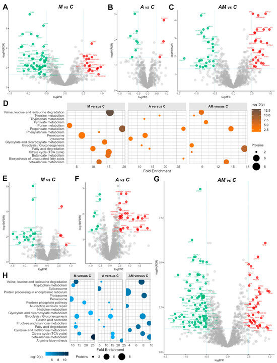 Volcano plots for the liver cytoplasmatic fraction, showing log2FC from M versus C (A), A versus C (B), and AM versus C (C), and for the kidney cytoplasmatic fraction, showing log2FC from M versus C (E), A versus C (F), and AM versus C (G), at an FDR-adjusted p value < 0.05, and log2 threshold (−0.5, 0.5). Green indicates significantly down-regulated proteins, red indicates significantly up-regulated proteins, and gray indicates proteins having expression changed below the FDR and log2FC criteria Enrichment chart for the top 10 KEGG pathways in liver (D) and kidney (H) cytoplasmatic fractions, sorted by the lowest p value. The C group represents the control group of weaned piglets (C) fed with a basal diet. The A group was fed with the basal diet plus a mixture of two antioxidant byproducts (grapeseed and sea buckthorn meal). The M group was fed with the basal diet artificially contaminated with two mycotoxins (AFB1 and OTA). The AM group represents the weaned piglets fed with the basal diet containing the mixture (1:1) of antioxidant byproducts and the two mycotoxins.