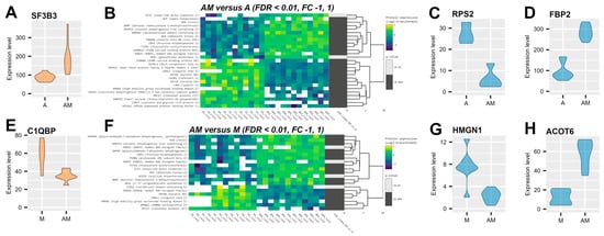 Impact of mycotoxins and antioxidants in the piglet’s diet. Violin plots represent protein expression level of splicing factor 3b subunit 3 (SF3B3) from liver cytoplasmatic samples from A and AM groups (A) and complement the C1q binding protein (C1QBP) from M and AM groups (E) and from kidney cytoplasmatic samples from ribosomal protein S2 (RPS2) (C) and fructose-bisphosphatase 2 (FBP2) (D) from A and AM groups, and for high mobility group nucleosome binding domain 1 (HMGN1) (G) and acyl-CoA thioesterase 6 (ACOT6) (H) from M and AM groups. Clustered heatmap of the differentially expressed proteins from AM versus A (B) and from AM versus M (F), filtered with the log2FC threshold set to exclude interval (−1, 1) and FDR-adjusted p value < 0.01. Yellow colour represents up-regulation, while blue represents down-regulation in the A group compared to the AM group. From left to right, expression values (log2 transformed) for replicates (4 biological × 3 technical) are shown for the A/M group and for the AM group, followed by significance values of the comparison to the A/M group. The M group was fed with the basal diet artificially contaminated with two mycotoxins (AFB1 and OTA). The A group was fed with the basal diet plus a mixture of two antioxidant byproducts (grapeseed and sea buckthorn meal). The AM group represents the weaned piglets fed with the basal diet containing the mixture (1:1) of antioxidant byproducts and the two mycotoxins.