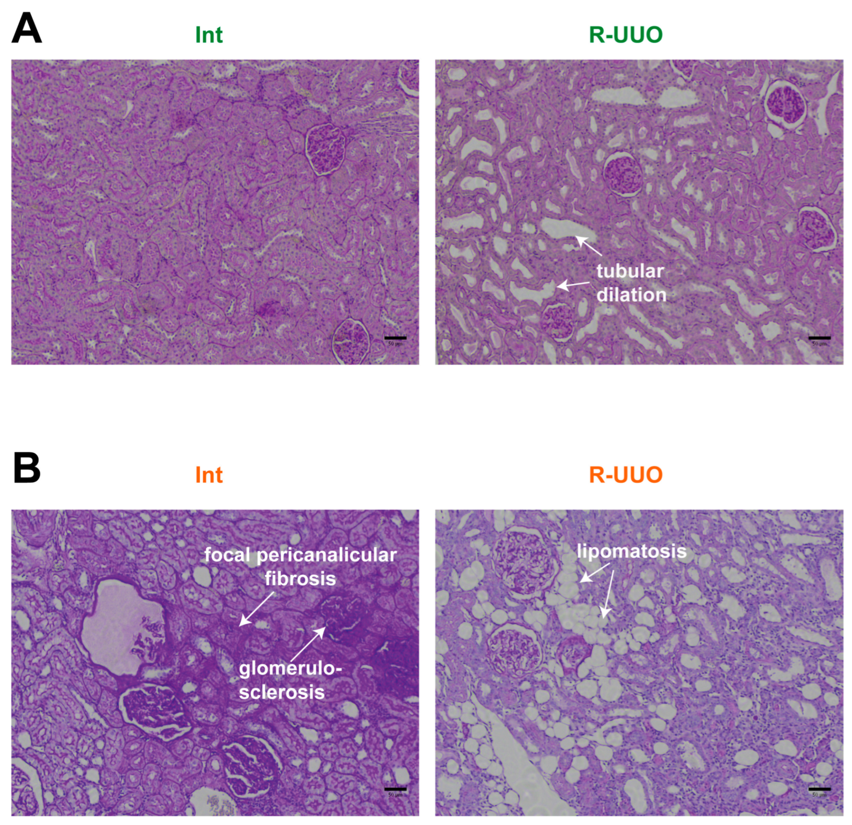 3.3. R-UUO-Induced Histopathological Changes in the Kidney
