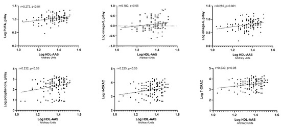 Notably, all the associations found with HDL-AAS held true, even when considering other factors like age, menopause, existing health conditions, and lifestyle. Interestingly, among all these dietary components, total PUFAs, driven by omega-6, were the strongest independent predictors of HDL-AAS. This finding aligns with several reports indicating that linoleic acid (LA), a polyunsaturated FA (PUFA), can replace saturated FAs in HDL, thereby boosting its levels, stability levels, and function [79,80]. However, some studies have not shown significant improvements in these parameters [81].