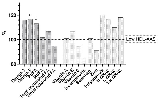 Intake of dietary FAs and antioxidants in individuals with high HDL-AAS to those with low HDL-AAS (high/low was based on median values). * p < 0.05, for the comparison between women with high HDL-AAS compared to those with low HDL-AAS.