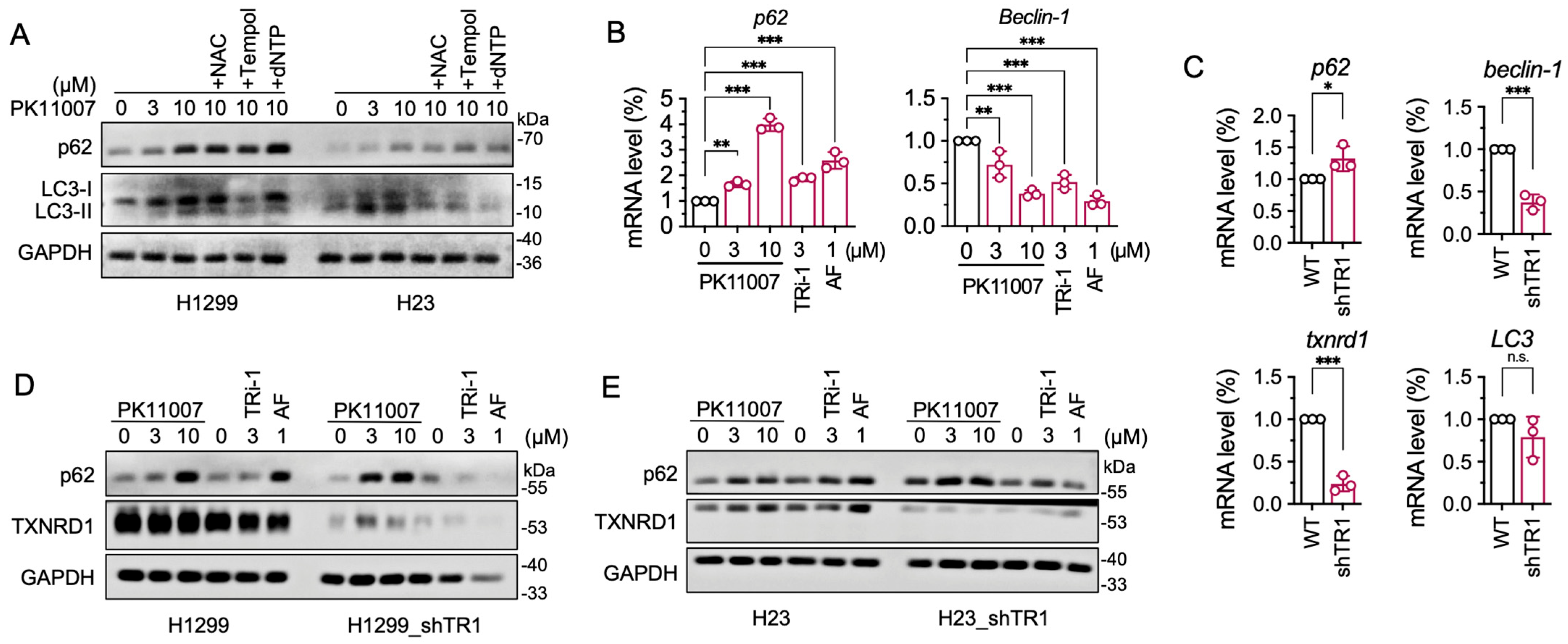 Zhou, H.; Sun, S.; Liu, H.; Li, T.; Xu, Y.; Yang, R.; Liu, H.; He, L.; Xu, W.; Guan, S.; et al. PK11007 Covalently Inhibits Thioredoxin Reductase 1 to Induce Oxidative Stress and Autophagy Impairment in NSCLC Cells. Antioxidants 2025, 14, 1222. https://doi.org/10.3390/antiox14101222
