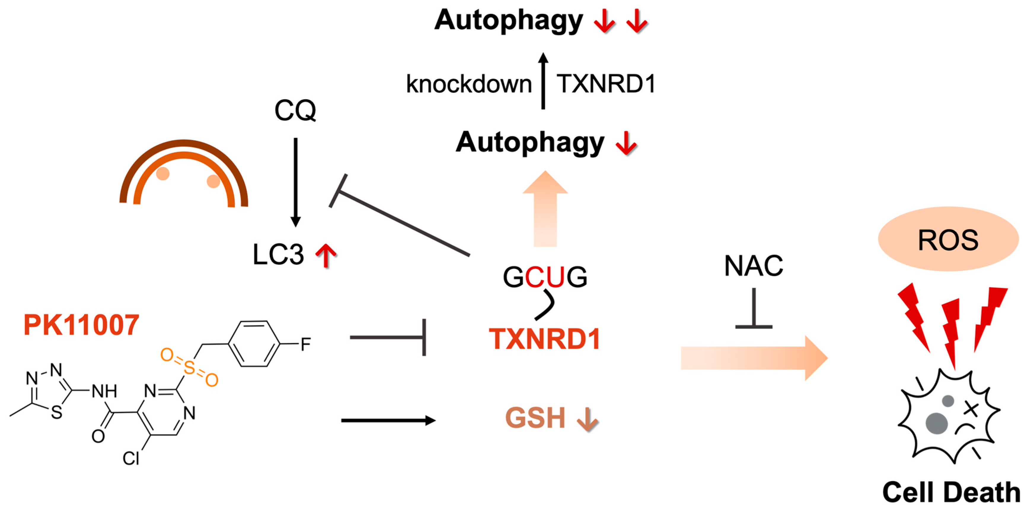 Zhou H, Sun S, Liu H, Li T, Xu Y, Yang R, Liu H, He L, Xu W, Guan S, et al. PK11007 Covalently Inhibits Thioredoxin Reductase 1 to Induce Oxidative Stress and Autophagy Impairment in NSCLC Cells. Antioxidants. 2025; 14(10):1222. https://doi.org/10.3390/antiox14101222