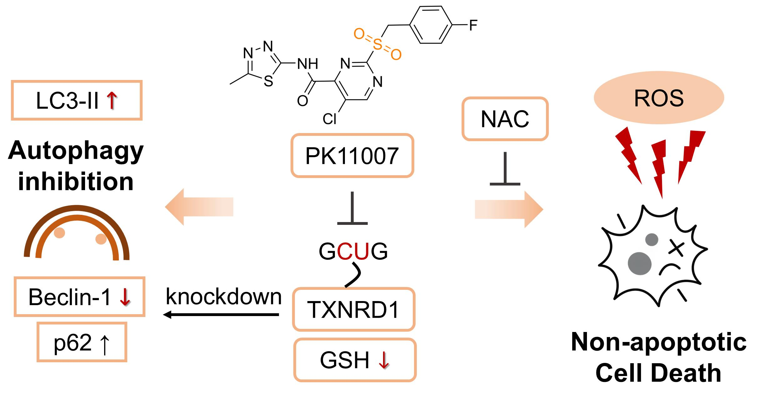 Zhou H, Sun S, Liu H, Li T, Xu Y, Yang R, Liu H, He L, Xu W, Guan S, et al. PK11007 Covalently Inhibits Thioredoxin Reductase 1 to Induce Oxidative Stress and Autophagy Impairment in NSCLC Cells. Antioxidants. 2025; 14(10):1222. https://doi.org/10.3390/antiox14101222