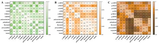 A Pearson correlation heatmap showing the relationships between polysaccharide, polyphenol, flavonoid, procyanidin, terpenoid, and tannin content and antioxidant indices (ABTS, FRAP, SAFR, SFR, ORAC, DPPH). (A–C), from left to right, represented the flesh, seed, and peel, respectively. All correlations were statistically significant (p < 0.05), with the intensity of the color indicating the strength of the correlation coefficient r.” to “All correlations were statistically significant (p < 0.05), * (p < 0.05), ** (p < 0.01), *** (p < 0.001), with the intensity of the color indicating the strength of the correlation coefficient r.