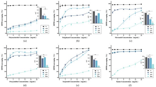 The concentration-response curves of DPPH radical scavenging activity for extracts of different bioactive compounds from avocado. Bar charts represented AUC values for different fractions, labeled sequentially as (a–f): polysaccharides, polyphenols, flavonoids, procyanidins, terpenoids, and tannic acid. * (p < 0.05), *** (p < 0.001), **** (p < 0.0001).