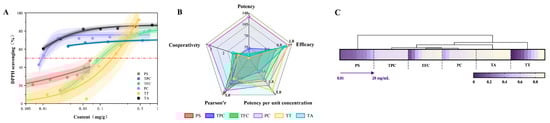 (A): The dose–response curves for extracts of different bioactive compounds from avocado seeds. (B): A comprehensive antioxidant radar chart. (C): The heatmap of DPPH Radical Scavenging Activity. PS: polysaccharides, TPC: total polyphenols, TFC: total flavonoids, PC: proanthocyanidins, TT: terpenoids, and TA: tannic acid.