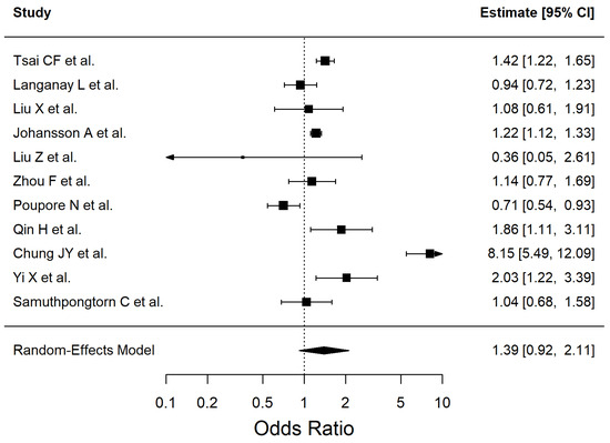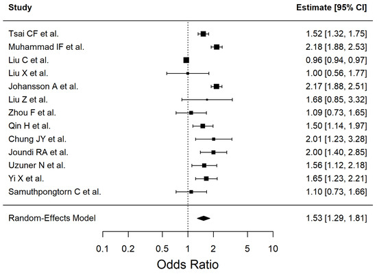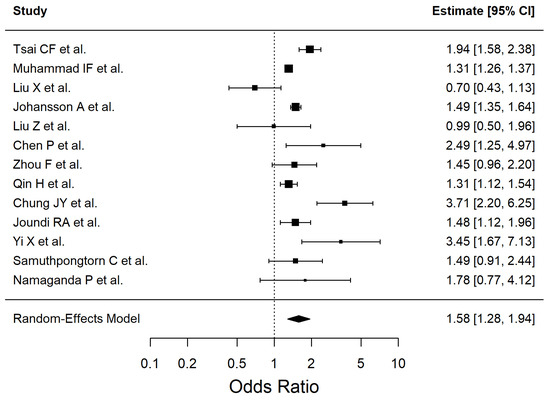 | Smoking | 1.56 | 1.09–2.23 | 0.0153 | 94.07 |