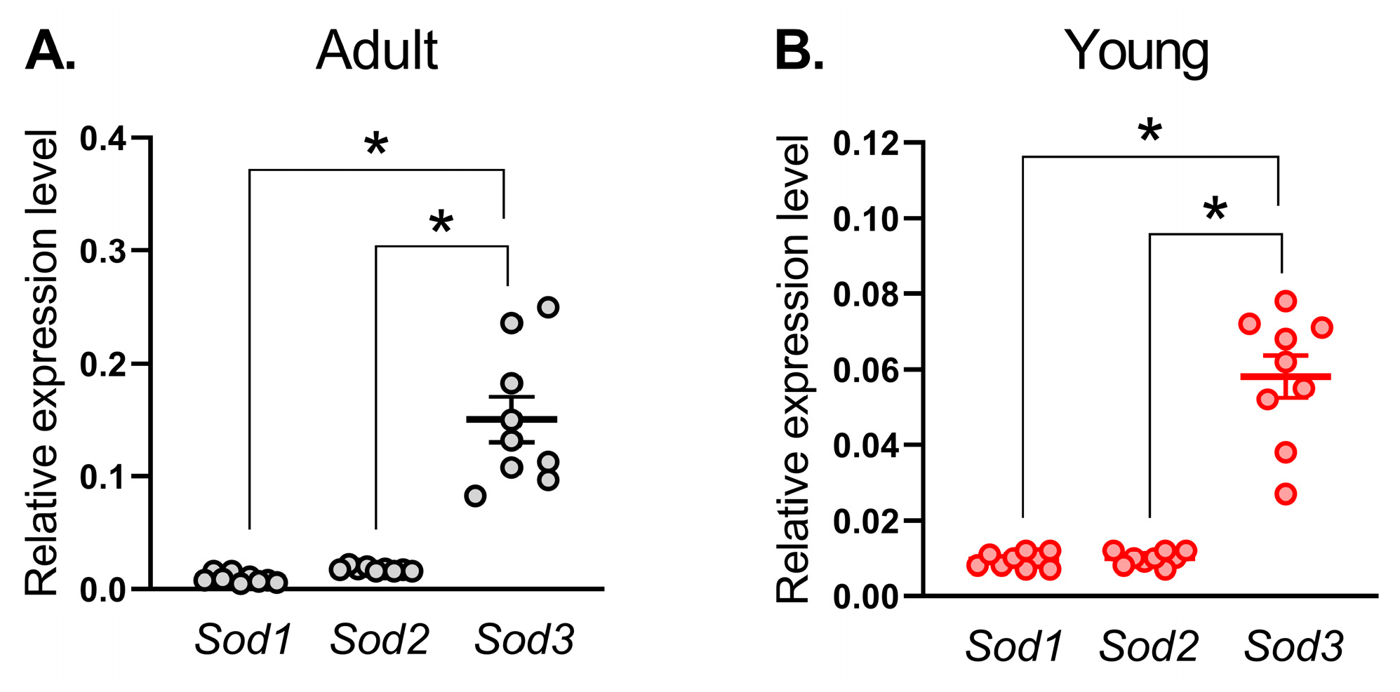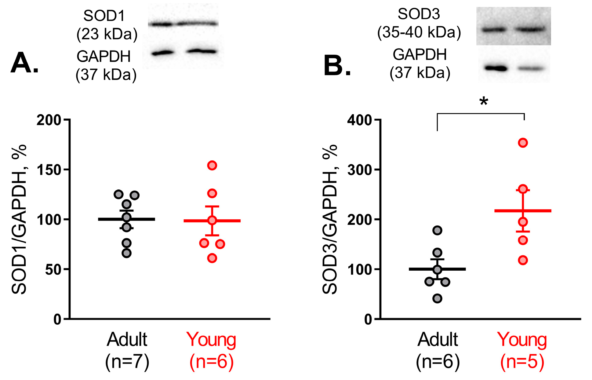 g for 5 min; the supernatant was kept at −20 °C till further analysis. Proteins were separated by SDS-PAGE and transferred to nitrocellulose membranes (Santa Cruz, Dallas, TX, USA) using the Trans-Blot Turbo transfer system (Bio-Rad). The transfer was visualized with Ponceau S staining. Thereafter, membranes (each containing samples from adult and young groups) were cut into two pieces at the level of appr. 28 kDa based on the corresponding levels of protein markers (Abcam, Cambridge, UK, cat. number 116027). The membranes were blocked with 5% nonfat milk (AppliChem, Darmstadt, Germany) in TBS with 0.1% Tween 20 (TBSt). Then, two pieces of the first membrane were incubated overnight with antibodies against GAPDH (mouse, Abcam, cat. number 125247, 1:2000 in TBSt with 5% milk, molecular weight 37 kDa) or SOD1 (rabbit, Sigma, St. Louis, MO, USA, cat. number SAB5200083 1:4000 in TBSt with 5% milk, molecular weight 23 kDa), and one piece of the second membrane was incubated overnight with antibodies against SOD3 (rabbit, Enzo, New York, NY, USA, cat. number ADI-SOD-106-F 1:1000 in TBSt with 5% milk, molecular weight 35–40 kDa). The next day, the membranes were washed from the primary antibodies and incubated with appropriate secondary antibodies: anti-mouse (Cell Signaling, Boston, MA, USA, cat. number 7076, 1:5000 in 5% milk) or anti-rabbit (Cell Signaling, Boston, MA, USA, cat. number 7074, 1:10,000 in 5% milk) for 1 h and visualized with SuperSignal West Dura Substrate (Thermo Fisher Scientific, Waltham, MA, USA) using a ChemiDoc (Bio-Rad, Hercules, CA, USA). Of note, since SOD3 and GAPDH have similar molecular weights (close to 40 kDa), membrane stained with antibodies against SOD3 was stripped using stripping buffer (for composition see