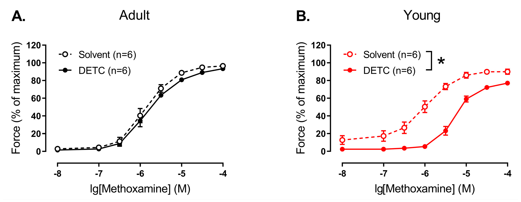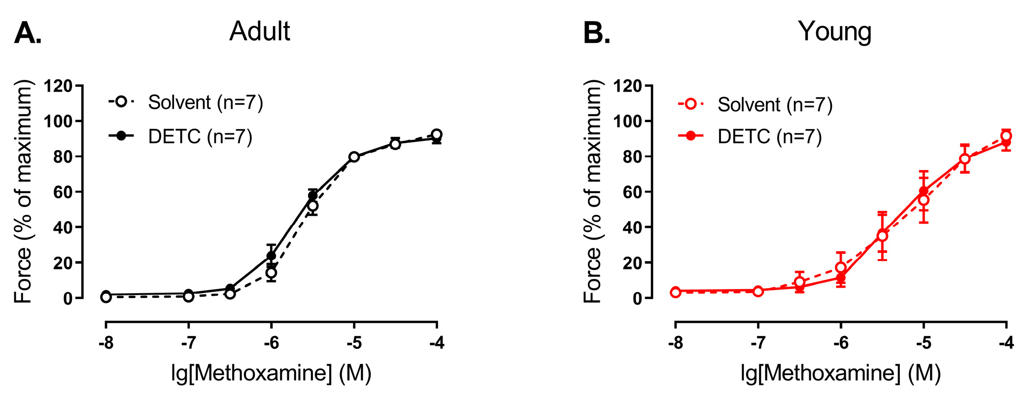 36]. In accordance with our molecular experiments, which demonstrated low activity and protein amount of Cu/ZnSODs in the arteries of adult rats, DETC had no influence on methoxamine-induced contractions of endothelium-denuded arteries in adult animals. Similarly, in previous studies, DETC had no effect on phenylephrine-induced contractile responses of rat aorta [