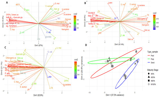 Exploratory multivariate analysis using PCA; (A) pulp; (B), peel; (C) seed and (D) Global analysis. Note: SS, soluble solid; TA, titratable total acidity; Ca, calcium; Fe, Iron; K, potassium; Mg, magnesium; Na, sodium; VitC, vitamin C; ac, acid; Zeinoxan, zeinoxanthin; Quercetin glu, Quercetin glucoside; E. coli, Escherichia coli; P. aeru, Pseudomonas aeruginosa; S. aureus, Staphylococcus aureus; S. mut, Staphylococcus mutans; C. albi, Candida albicans; C. trop, Candida tropicalis.