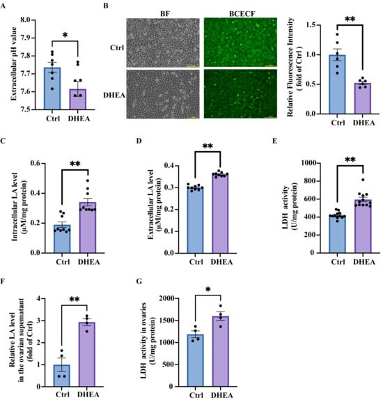DHEA induces a decrease in pH and lactic acid accumulation in granulosa cells. KGN cells were treated with DHEA (0, 50 μM) for 24 h: (A) pH value of culture medium measured by a blood gas analyzer. n = 7 per group. (B) Representative fluorescence micrographs of intracellular pH determined by BCECF and the statistical analysis of fluorescence intensity. Scale bar = 500 μm. n = 6 per group. (C) The intracellular lactic acid (LA) concentrations in cells. n = 9 per group. (D) The lactic acid concentrations in culture medium. n = 9 per group. (E) The activity of lactic acid dehydrogenase (LDH) in the cells. n = 12 per group. The mice were injected (s.c.) with solvent (Ctrl) or DHEA for 20 consecutive days. (F) The lactic acid concentrations in the ovarian supernatants. n = 4 per group. (G) The ovarian LDH activity in the mice. n = 4 per group. Data are presented as mean ± SEM. *, p < 0.05, **, p < 0.01.