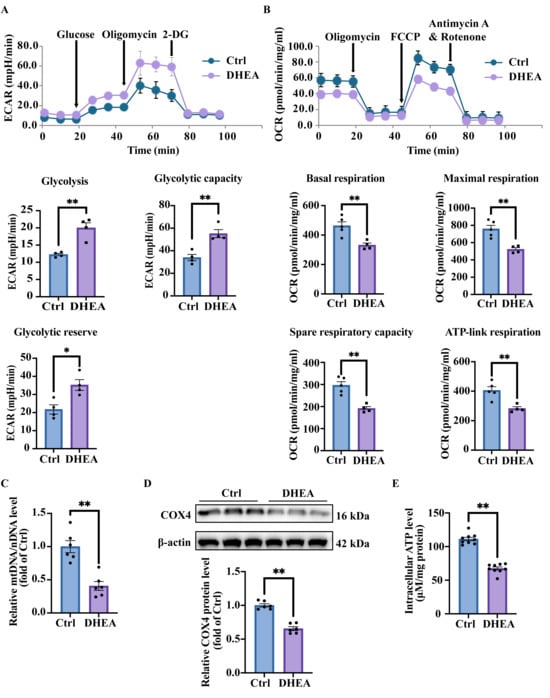 Mitochondria serve as the exclusive sites of aerobic respiration in eukaryotic cells, while anaerobic respiration (glycolysis) takes place in the cytosol independently of mitochondria. The shift in respiratory preference in DHEA-treated KGN cells may be attributed to the reduction in mitochondria, which is essential for oxidative phosphorylation. To quantify the mitochondrial content, we measured relative levels of mitochondrial-specific markers in KGN cells treated with or without DHEA, including mtDNA ND1 and nDNA SLCO2B1. The results demonstrated that DHEA treatment significantly reduced the mtDNA copy number, as quantified by the mtDNA/nDNA ratio (p = 0.0004) (Figure 3C). The protein expression of another mitochondrial protein COX4 was also examined. Consistent with the mtDNA copy number, we observed a marked downregulation of COX4, a mitochondrial marker protein, in DHEA-treated cells (p < 0.0001) (Figure 3D). Intracellular ATP quantification also revealed a significant reduction in DHEA-treated cells (p < 0.0001) (Figure 3E), further confirming the mitochondrial dysfunction in DHEA-treated cells.