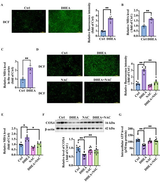 To further validate the reciprocal relationship between oxidative stress and mitochondrial damage, an antioxidant agent NAC was used in cell experiments. DCF fluorescence imaging demonstrated a substantial increase in intracellular ROS levels in DHEA-treated cells. However, the co-treatments of cells with DHEA and NAC significantly reduced ROS accumulation compared with DHEA treatment alone (p < 0.0001). Notably, NAC treatment alone did not have any detectable effect on basal ROS production (p > 0.9999) (Figure 4D). Intracellular MDA levels exhibited a trend similar to ROS (Ctrl vs. DHEA p = 0.0006; DHEA vs. DHEA + NAC p = 0.0015) (Figure 4E). NAC showed antioxidant efficacy by mitigating DHEA-induced mitochondrial damage, as evidenced by significantly higher expression of the mitochondrial marker COX4 in NAC-treated cells compared with DHEA treatment alone (Ctrl vs. DHEA p < 0.0001; DHEA vs. DHEA + NAC p = 0.011) (Figure 4F), indicating the recovery of mitochondrial quantity. Consistent with our earlier findings, DHEA-treated cells exhibited significantly reduced ATP production (p < 0.0001). In contrast, DHEA + NAC treatment restored ATP generation to levels comparable to the Ctrl group (p = 0.0006) (Figure 4G). Notably, NAC alone showed no effect on mitochondrial parameters, as both COX4 expression and ATP production remained unchanged compared with the Ctrl group (p > 0.9999) (Figure 4F,G). In summary, NAC treatment protected GCs from androgen excess-induced mitochondrial damage.