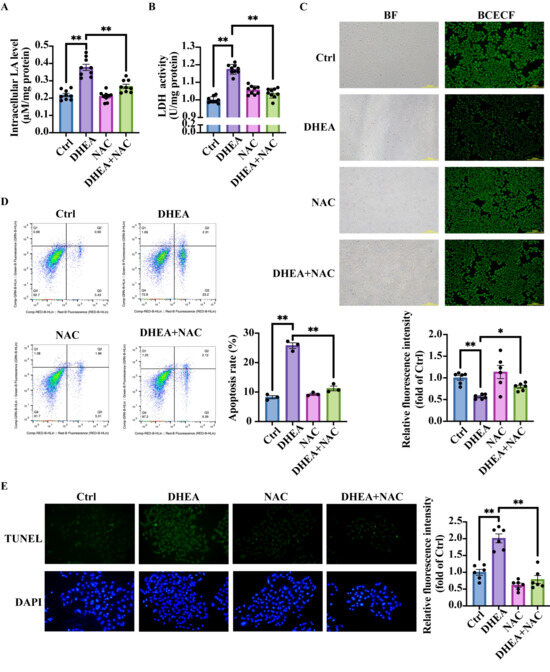 Since NAC improves mitochondrial function and reduces lactic acid accumulation, we next examined whether NAC could attenuate cell apoptosis. The TUNEL assay was thus performed to detect the apoptosis of KGN cells in four groups: Ctrl, DHEA, NAC, and DHEA + NAC. Results from flow cytometry revealed that DHEA significantly increased the number of apoptotic cells, whereas treatment of cells with DHEA + NAC markedly reduced cell apoptosis (Ctrl vs. DHEA p < 0.0001; DHEA vs. DHEA + NAC p < 0.0001) (Figure 5D). The TUNEL assay results were consistent with flow cytometry analysis, as illustrated in Figure 5E (Ctrl vs. DHEA p < 0.0001; DHEA vs. DHEA + NAC p < 0.0001).