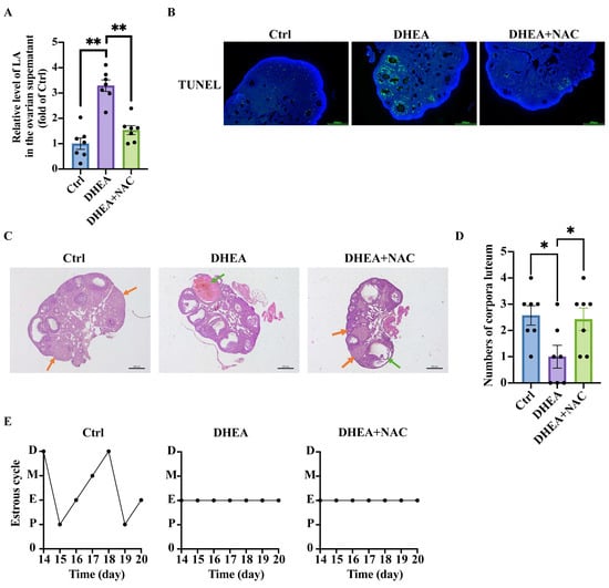 Based on the in vitro findings, we administered NAC to DHEA-induced PCOS mice via intragastric gavage to evaluate its effects on ovarian function. As expected, the lactic acid levels in the ovarian supernatant of DHEA + NAC mice were significantly lower than those in DHEA animals (Ctrl vs. DHEA p < 0.0001; DHEA vs. DHEA + NAC p < 0.0001) (Figure 6A). TUNEL staining of mouse ovarian sections showed the increased apoptotic GCs in the DHEA group compared with Ctrl group (Figure 6B). As expected, the apoptotic GCs in the DHEA + NAC mice were lower than DHEA mice, as indicated by the reduced green fluorescence (Figure 6B). Histological analysis of mouse ovaries revealed that DHEA-treated mice showed typical polycystic ovarian morphology, marked by the presence of multiple cystic follicles. In contrast, DHEA + NAC mice showed normal ovarian morphology, exhibiting no significant cystic formation (Figure 6C). The corpus luteum is a transient endocrine structure derived from post-ovulatory follicles, with the number of corpora lutea serving as a key indicator of ovarian ovulatory ability. The DHEA-induced PCOS mice exhibited significantly fewer corpora lutea than Ctrl, while NAC supplementation partially restored luteal formation in DHEA-treated mice (Ctrl vs. DHEA p = 0.0177; DHEA vs. DHEA + NAC p = 0.0376) (Figure 6D). These data suggested that NAC partially improved ovarian function in PCOS mice.