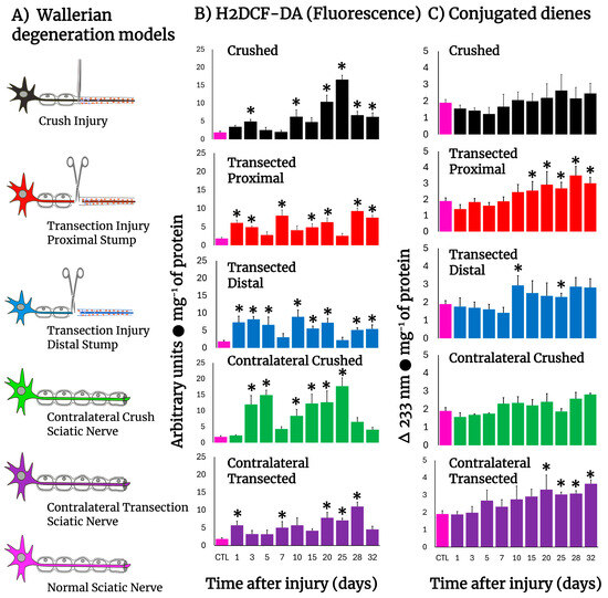 Production of ROS (H2DCF-DA fluorescence) and lipid peroxidation by-products in injured sciatic nerves after crush and transection and in the respective contralateral (intact) nerves. Results are expressed as mean ± SD of 5 determinations for each experimental point of the different models of nerve sciatic injury shown in panel (A) (controls: rose bars; crushed nerves: black bars; transected proximal nerves: red bars; transected distal nerves: blue bars; contralateral nerves (crushed): green bars, and contralateral nerves (transected): purple bars, for H2DCF-DA fluorescence products (panel (B)), and conjugated dienes (panel (C))). Statistical significance (*) p < 0.01.