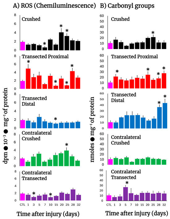 After transection, production of free radicals barely increased in proximal and distal nerves, except for the first day post-injury in the proximal nerves (Figure 2A), clearly contrasting with the higher rates of H2DCF-DA reacting by-products found in these nerves (Figure 1B,C), while crushed nerves show a significant peak in free radicals’ production on day 20 (Figure 2A). Interestingly, the contralateral nerves from crushed nerves have two peaks of chemiluminescence at 5 and 25 days after injury (Figure 2A), a phenomenon not present in transected nerves that show a lower production of free radicals even when compared with the control group (Figure 2A).