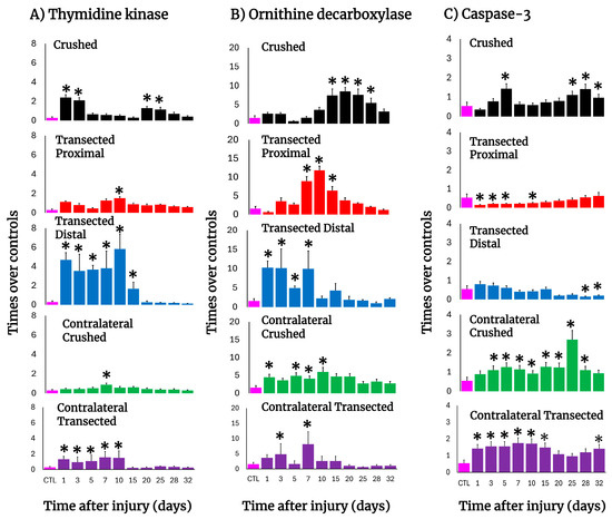 Parameters are indicative of cell proliferation and apoptosis in injured sciatic nerves after crush and transection and in the respective contralateral (intact) nerves. Results are expressed as mean ± SD of 5 determinations for each experimental point of the different models of nerve sciatic injury shown in Figure 1 and defined by the colored bars for the thymidine kinase (TK; panel (A)) and ornithine decarboxylase (ODC; panel (B)) activities, as well as for active caspase-3 (panel (C)). The control values were TK: 0.29 ± 0.11 nmols of formed [3H]TMP • hour−1 • mg−1 of protein, ODC: 1.56 ± 0.58 nmols • min−1 • mg−1 of protein, and caspase-3: 0.54 ± 0.19 units (1 unit corresponds to 1 nmol of cleaved substrate per hour). Statistical significance (*) p < 0.01.