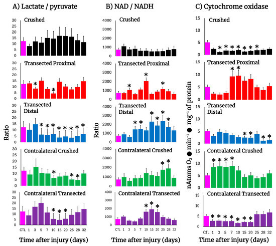 The lactate/pyruvate ratio, cytoplasmic NAD/NADH potential, and cytochrome oxidase activity in injured sciatic nerves after crush and transection and in the respective contralateral (intact) nerves. Results are expressed as mean ± SD of 5 determinations for each experimental point of the different models of nerve sciatic injury shown in Figure 1 and defined by the colored bars for the lactate/pyruvate ratio (panel (A)) and the NAD/NADH ratio (panel (B)), as well as for the activity of cytochrome oxidase (panel (C)). Statistical significance (*) p < 0.01.