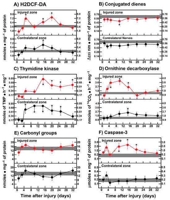 Parameters indicative of oxidant stress, proliferation, and apoptosis in caudofemoralis muscle after crushing the right sciatic nerve. The results are expressed as mean ± SEM of 5 determinations for each experimental point. Number of dienes correspond to those conjugated in membrane layers, and carbonyl(s) groups correspond to oxidized proteins. The shadowed horizontal bar is the control range, and symbols in red represent muscle homogenates from the injured zone, as well as those from the contralateral zone (black circles). H2DCF-DA: 2′,7′-dichlorodihydrofluorescein diacetate. Statistical significance (*) p < 0.01.
