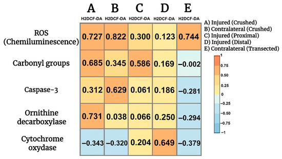 Correlations among parameters indicative of oxidant stress, cell proliferation, apoptosis, and onset of mitochondrial biogenesis in injured sciatic nerves after crush and transection and in the respective contralateral (intact) nerves. Heat maps show the relation between two sets of data. This relation is summarized with the Pearson’s correlation coefficient (r) for each relation in each scatter plot: H2DCF-DA fluorescence vs. ROS (chemiluminescence), against carbonyl groups, vs. caspase-3 activity, against ODC activity, and finally H2DCF-DA fluorescence vs. cytochrome oxidase activity.