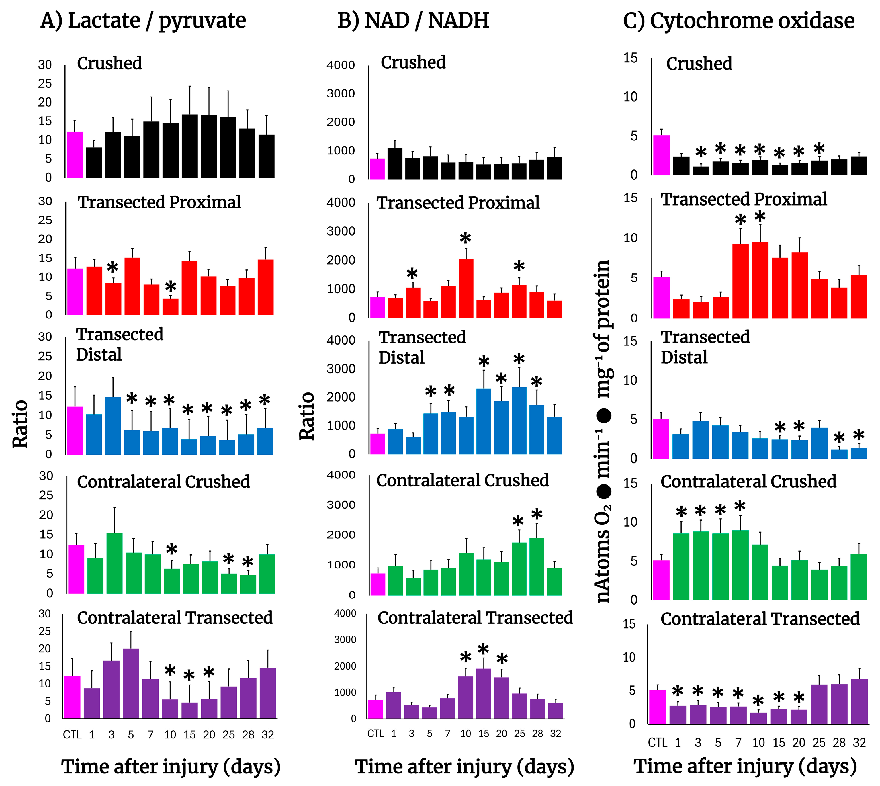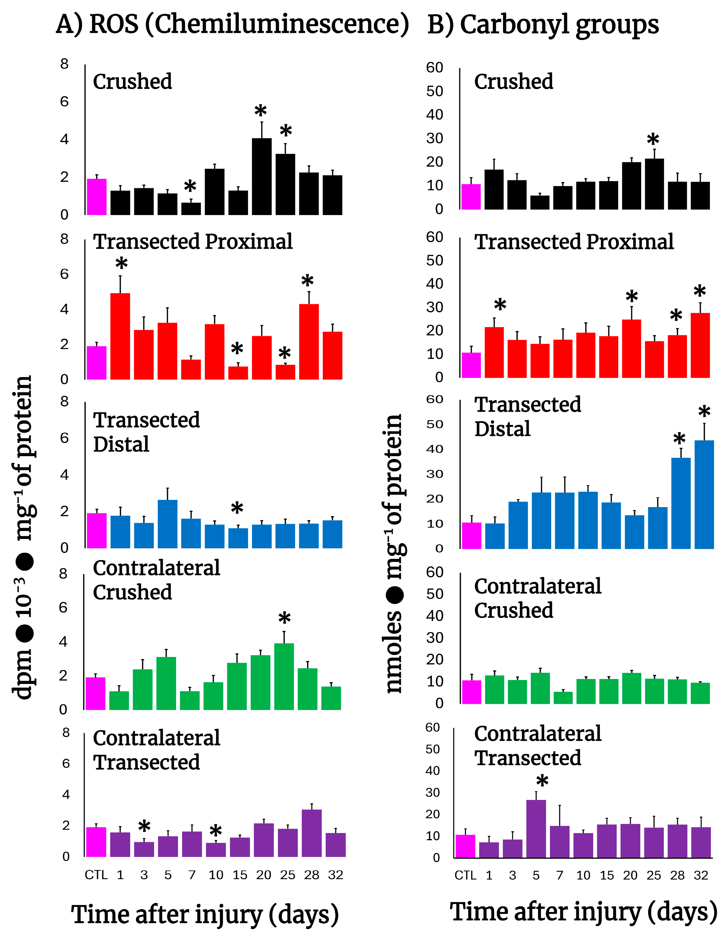 3.4. Rate of Protein Oxidation (Carbonyl Groups) in Crushed or Transected Nerves